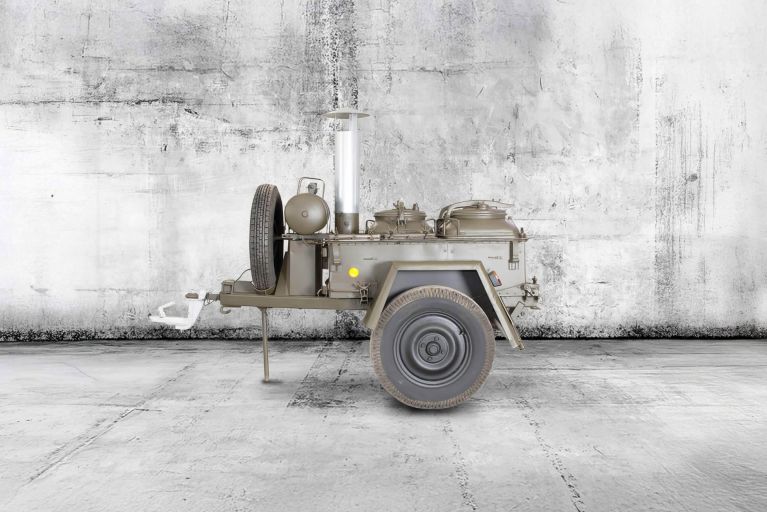 Die Feldküche besitzt 2 Edelstahlkessel à 125 l, 2 Edelstahlbräter à 45 l, 2 Warmwasserbehälter à 28 l und 2 Backröhren à 78 l. Die Kessel und Pfannen arbeiten nach dem Druckgarprinzip. Die gesamte Arbeitsfläche besteht aus Edelstahl. Die Kessel sind doppelwandig und mit einem Ablasshahn ausgestattet. Die Beheizung der 4 Brennstellen erfolgt entweder mit dem serienmäßigen Diesel- bzw. Petroleumbrenner, dem optionalen Festbrennstoffeinsatz oder der optionalen Propanbrennern. Seitlich im Gerät befindet sich viel Stauraum für Zubehör. Das Fahrzeug besitzt eine Auflaufbremse.